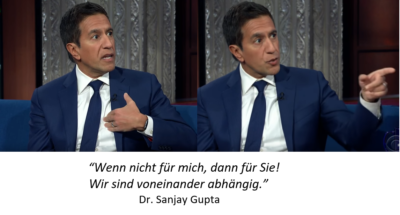 Der Schauplatz des Interviews mit Dr. Gupta in Stephen Colberts Late Show (Englisch) scheint zunächst eher oberlflächlich, aber Dr. Gupta berührt einige verblüffende Festellungen und gibt Einblick in einige entsetzliche Entscheidungen, die Ärzte in Krankenhäusern treffen müssen. Aber eine andere Beobachtung war besonders beeindruckend und hat mich berührt. In diesem Mainstream-Kontext tauchte eine tiefe spirituelle Weisheit an die Oberfläche, die unserem ganzen Leben zugrunde liegt. Am besten zitiere ich Dr. Gupta selbst: